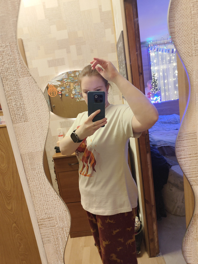 Верх комплекта — свободная однотонная футболка с ярким принтом Лошади. Современная графика подчёркивает новогоднюю тематику, а спущенный рукав и круглая горловина с аккуратной окантовкой делают посадку комфортной и расслабленной. Футболка не стесняет движений и легко садится по фигуре благодаря свободному силуэту.
